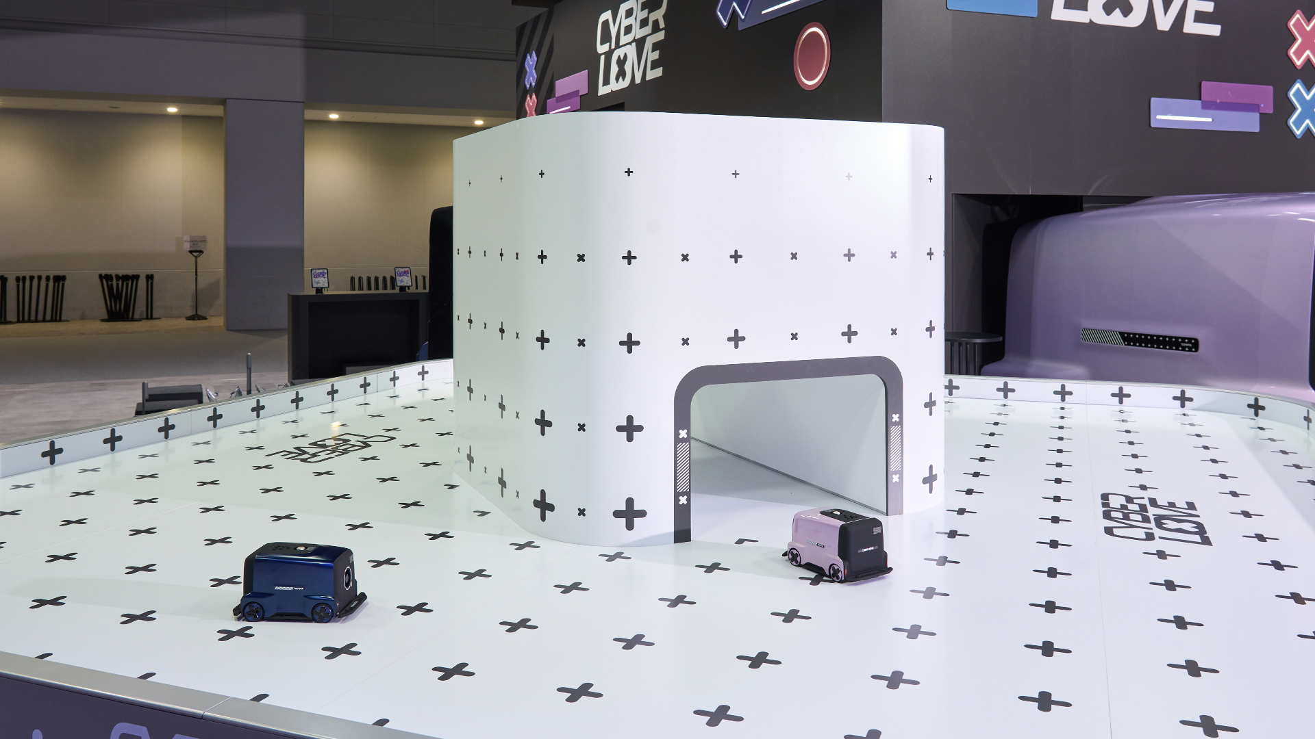 来場者はCYBER LOVEの中に乗り込み、会場内に展示されているジオラマの上を走るラジコンを操作。